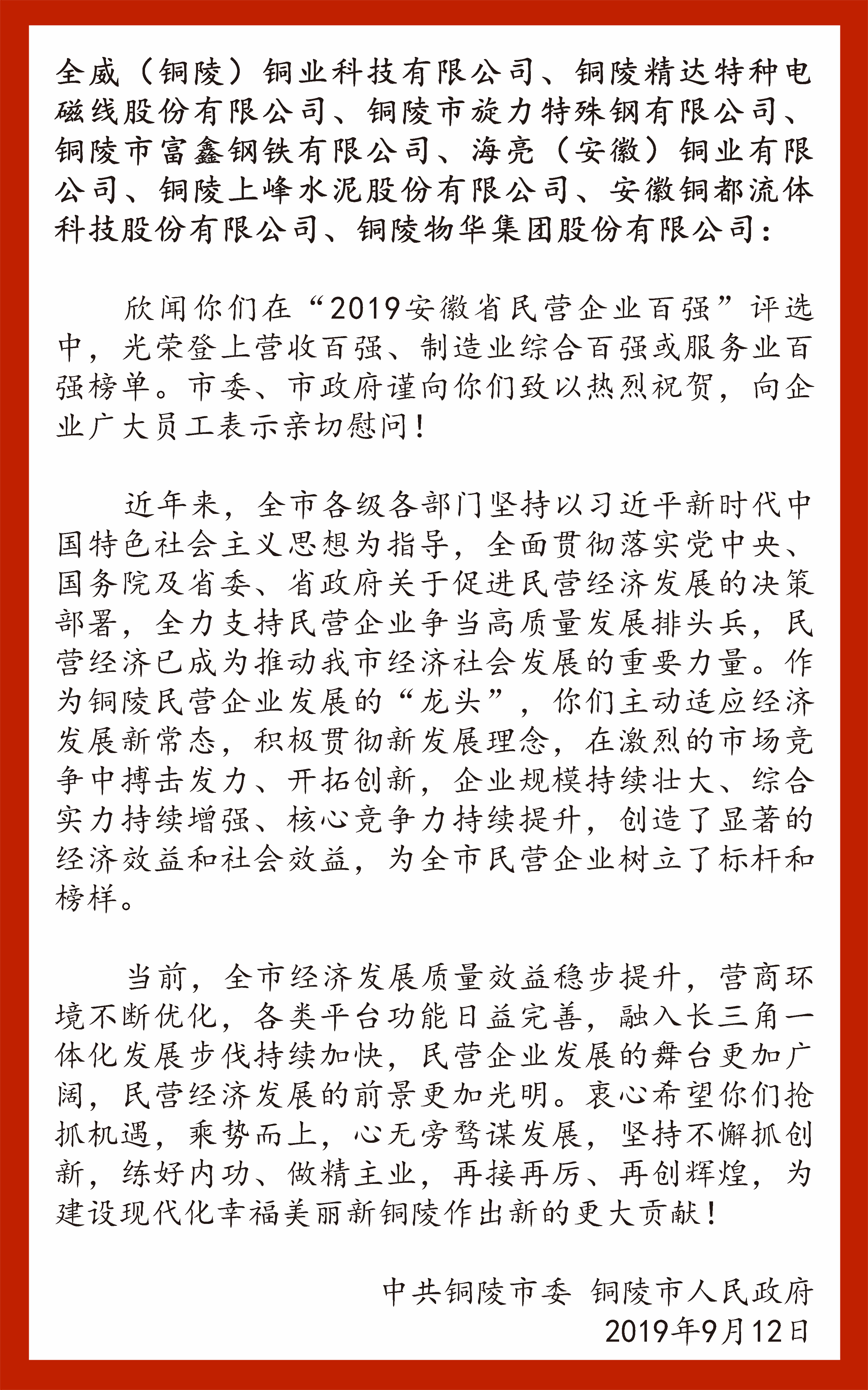9月12日,在中秋佳節(jié)即將來臨之際,中共銅陵市委、銅陵市政府對(duì)銅都流體榮登“2019安徽省民營企業(yè)百強(qiáng)”榜單致以熱烈祝賀,對(duì)企業(yè)員工表示親切慰問!