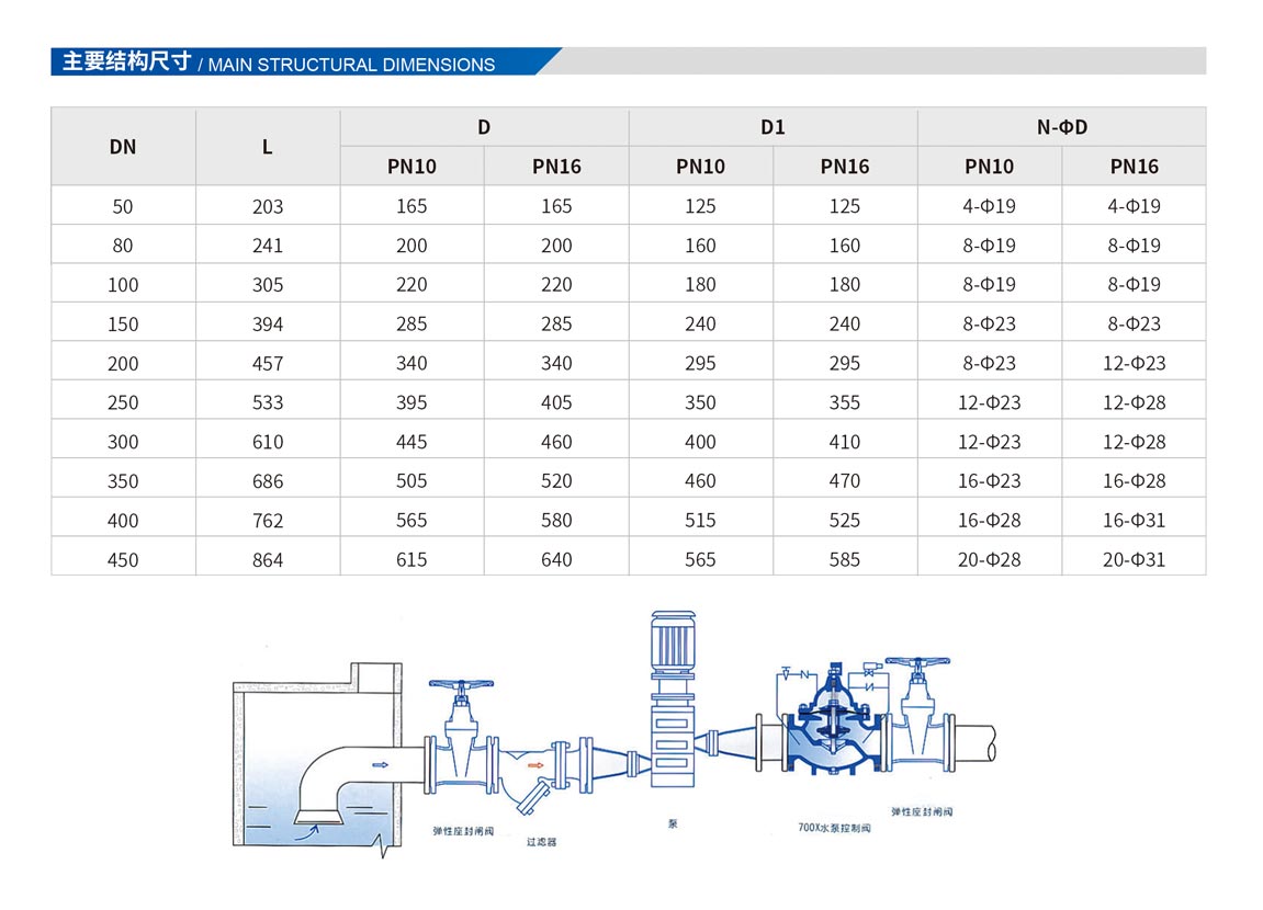 700X水泵控制閥,是一種安裝在高層建筑以及其他給水系統(tǒng)的水泵出口處,防止介質(zhì)倒流的逆止類閥門。當(dāng)水泵即將停止供水前,閥門先行緩幔關(guān)閉90%左右,防止突然停泵而產(chǎn)生的水錘和水擊聲:當(dāng)水泵完全停止后,閥門再完全關(guān)閉,防止泵出的水回流,有效地保護(hù)水泵,免受回流的沖擊而產(chǎn)生反轉(zhuǎn)。該產(chǎn)品是水泵出口必不可少的保護(hù)裝置。閥門呈流線型設(shè)計(jì),通過電磁閥的導(dǎo)控實(shí)現(xiàn)準(zhǔn)確的啟閉,使用安全可靠,有效地防止水錘和水擊聲,使用壽命長(zhǎng),安裝、維修方便。